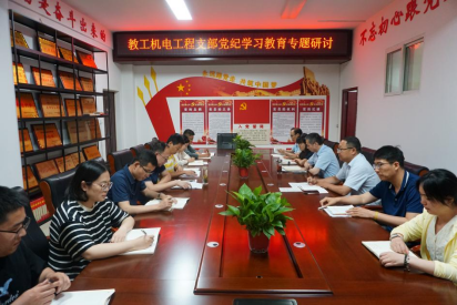 64日下午,机械工程学院党总支教工机电工程支部在5号实训楼5210室召开党纪学习教育专题研讨会,副校长朱焕立以普通党员身份参加支部活动。