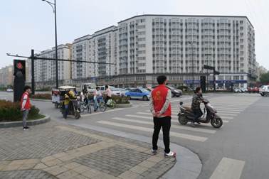 志愿者们身穿红色马甲,在路口指挥交通。我院学生分会副主席宋聿涛对各个路口的志愿者进行了交通安全知识培训,对同学们站立的位置、执勤手势语、所从事的工作进行了详细安排。随后,分布在路口的志愿者按规定动作绿灯放行红灯阻止,并不断劝阻行人不要闯红灯、电动车不占机动车道行驶,扶送老人、小孩过马路,整个过程志愿者们始终面带微笑、文明执勤,他们的行为赢得了市民们的一致好评。在志愿者们的指挥和劝导下,违反交通规则的现象逐渐减少,大家都能做到文明出行,这让志愿者们倍感欣慰。