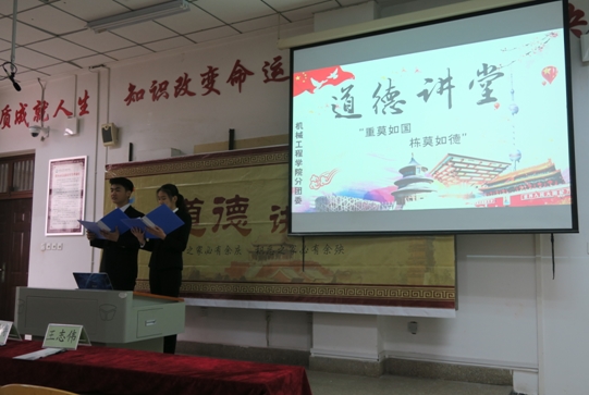 为推进我校道德讲堂活动常态化,提升我校精神文明创建工作水平。2018年12月25日下午2:30,由校党委宣传部主办、机械工程学院承办的道德讲堂活动在JX6103举行,此次道德讲堂以“重莫如国,栋莫如德”为主题。我院杨彦涛书记,王志伟老师,李晓东老师和刘跃昆老师出席了此次活动。我院18级各班代表参加此次活动。