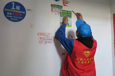 活动伊始,青年志愿者分小组进行工作,带上板刷,小铲等工具以饱满的热情投身到活动中来。丢在地上的广告纸,志愿者就将它们拾起扔进先前准备的垃圾袋;发现栏杆上粘的“小广告”,就用手把它撕下来,宣传栏“顽固的小广告”,就用小铲逐一耐心地铲掉,然后用擦布擦净;对于此次