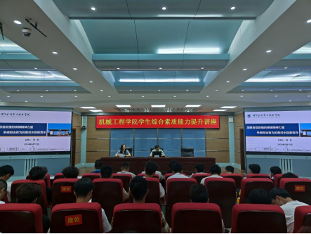 为加强机械工程学院团学干部队伍建设,进一步提升团学干部政治素养和工作能力,有效发挥团学干部榜样引领作用,机械工程学院于6月11日下午在3号实训楼水利报告厅举办学生综合素质能力提升专题讲座。机械工程学院院长范龙为全体学工人员及团学干部进行授课,讲座由学院党总支副书记张嫚主持。
