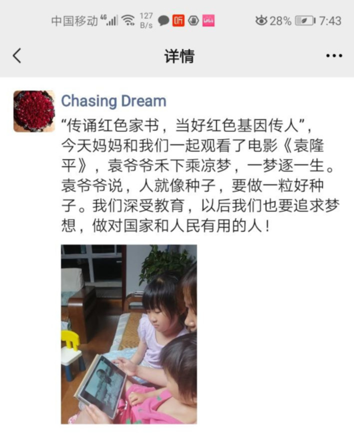 学院党总支副书记杨彦涛积极传达上级工会组织文件精神,安排部署六一儿童节具体庆祝活动,并带领全体教职工学习红色家书——赵一曼的故事。教职工以小家为单位带领儿童积极开展“传诵红色家书,当好红色基因传人”亲子阅读活动,陪伴孩子们度过了一个欢乐的儿童节,并将活动开展情况积极上传朋友圈。在这个特别的日子学院也特别关爱14周岁以下的教职工子女,精心为其准备了节日礼物。