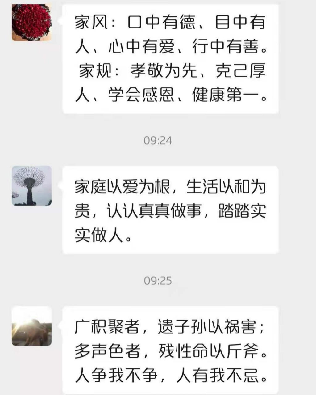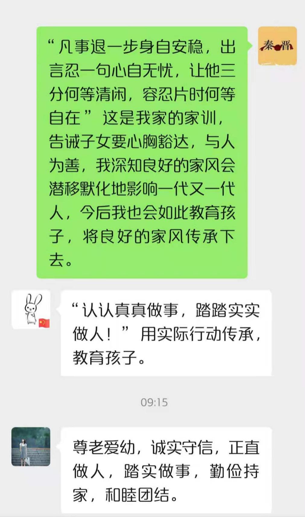 大家现场分享之后也积极在微信群中分享各自小家的家规家训家风,纷纷表示要在日常生活中让我们的家规家训家风从墙上走下来,从书中走出来,走到每一个家庭成员的心里,落实在每一天的日常行动中。