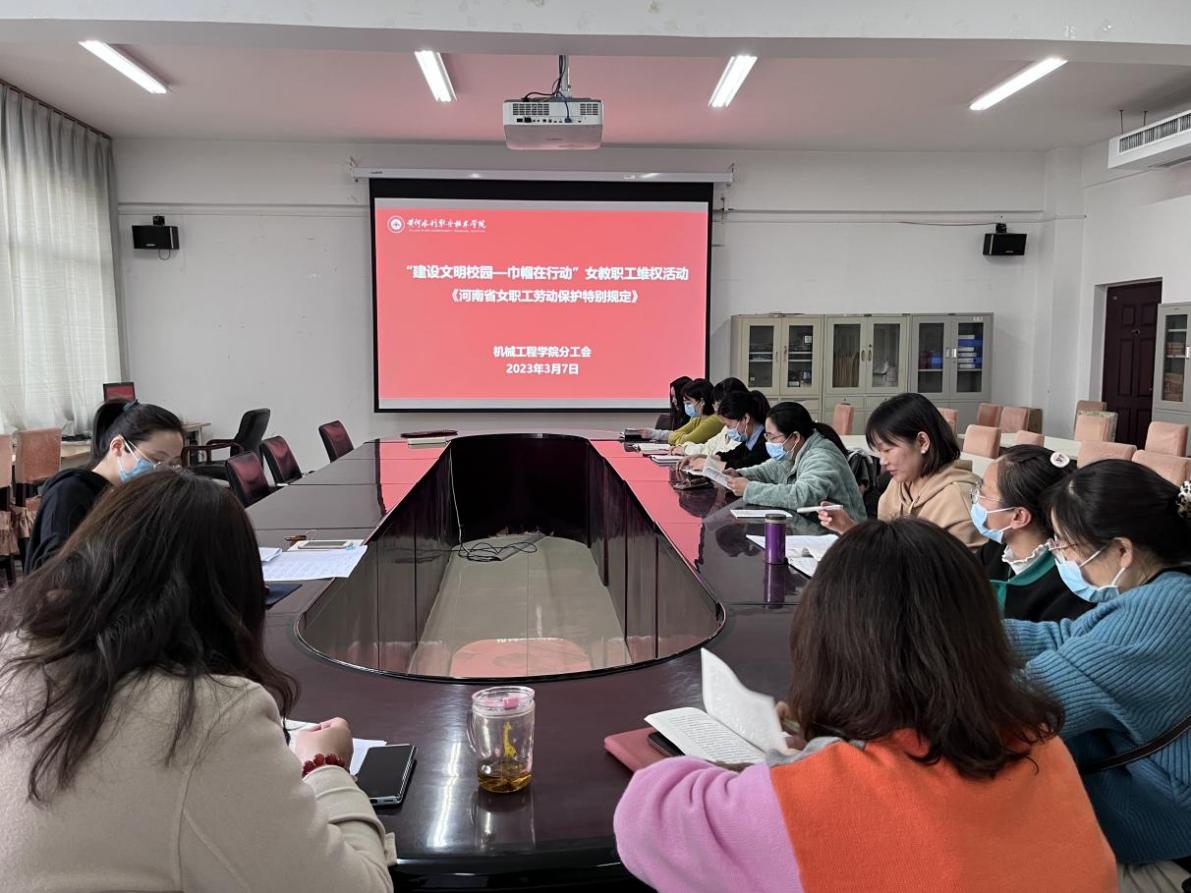 为保障女教职工合法权益,提升女教职工维权意识,建设和谐文明校园,按照校工会委员会要求,3月7日下午,机械工程学院分工会在5号实训楼SY5211会议室开展“建设文明校园—巾帼在行动”女教职工维权活动。全体女教职工参加本次活动。
