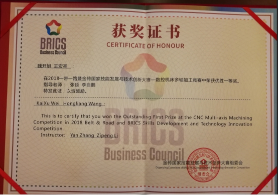 为搭建技能发展和技术创新的人才国际合作平台,促进技能发展和技术交流工作,加快技能人才培养,共同促进和提升技能水平,金砖国家工商理事会(BRICS BC)、金砖国家技能发展与技术创新大赛组委会、一带一路暨金砖国家技能发展国际联盟(IASDBR)于2018年9月4日—8日在河北廊坊职业技术学院举办“2018一带一路暨金砖国家技能发展与技术创新大赛之数控多轴加工”赛项中国赛区决赛。我校机械工程学院张延、李自鹏和盛任老师作为指导教师,加班加点,牺牲节假日带领学生利用暑期进行高强度集训。在校领导的关怀、教务处的支持下,我校选派机械工程学院教师李自鹏带队,数控技术专业学生魏开旭、王宏亮为代表参加了本次决赛。