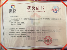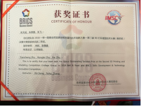 本项赛事是在“一带一路”和“金砖五国”时代背景下,针对3D打印技术应用人才培养开展的一项大型赛事。接到赛事邀请后,机械学院率先行动,积极组队,在校领导和学院领导大力支持下,进行了长达半年的培训和学习。经过严格训练和预赛选拔,模具教研室宋新、张豫徽老师指导的学生朱飞、朱荣磊、朱天成从众多高手中脱颖而出,以初赛第三名、一等奖好成绩晋级决赛。决赛中参赛选手积极应对,圆满完成了赛前创新产品设计的答辩,连续六小时内完成了新产品的扫描、逆向建模、创新设计、3D装配等任务,展现出扎实的专业技能基本功和优秀的创新能力。