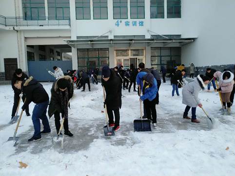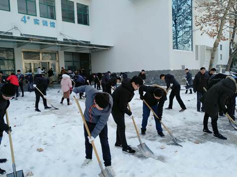1月5日上午机械工程学院全体师生志愿者将4号实训楼前积雪清扫干净