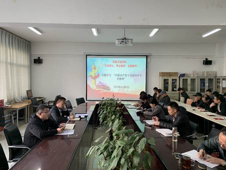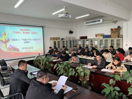 为稳步推进“不忘初心、牢记使命”主题教育工作,深入贯彻落实中国共产党十九届四中全会精神,11月5日下午,机械工程学院在院会议室(SY5211)开展主题教育专题学习中国共产党十九届四中全会精神活动。学院领导班子成员及全体教职工参加学习活动。学习活动由院党总支书记王振强主持。