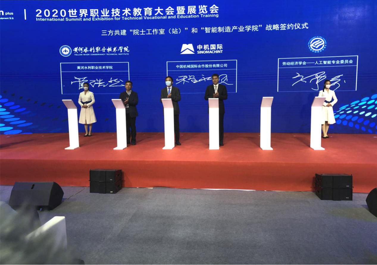 11月18日,在2020世界职业技术教育大会暨展览会开幕式上,我校与中国机械工业集团-中国机械国际合作股份有限公司(以下简称“中机国际”)、中国劳动经济学会-人工智能专业委员会签署了“院士工作室(站)”、“智能制造产业学院”战略合作协议。教育部职成司副司长谢俐、中国职业技术教育学会副会长史薇、学校副校长菅浩然,中机国际总经理赵立志、中国劳动经济学会副秘书长郭丰荣、中机国际副总经理程永顺等出席签约仪式。对外联络与合作处、机械工程学院等部门负责人,中机国际及公司有关部门和下属企业负责人参加了签约仪式。参加大会的500余家国内外学校、政府、企事业等代表见证了签约仪式。