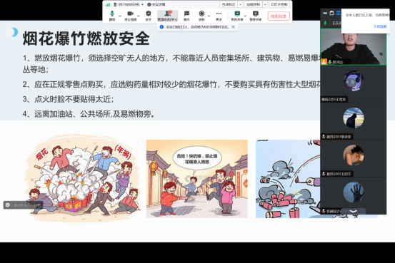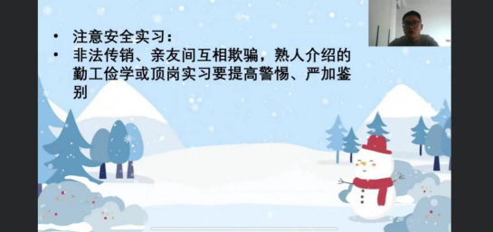 在班会中,各位辅导员通过生动形象的语言,结合近期安全事故案例,以图片、视频等形式围绕人身安全、交通安全、饮食安全、消防安全、网络安全、心理健康及实习安全等十方面内容对学生进行了假期各项安全知识教育,让同学们对安全的重要性有了更深切的认识。同时,各位辅导员还积极引导同学们利用假期多读书,多学习,加强体育锻炼,积极承担家务劳动,加强与家人、老师的沟通,防止意外发生,让寒假生活更加丰富多彩。