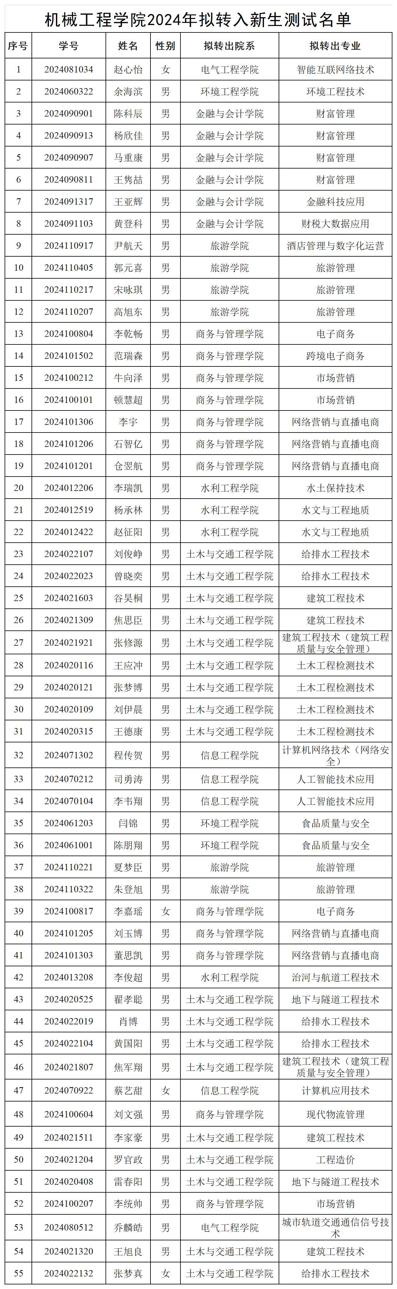2024级申请转入机械工程学院并且转出学院(现所在学院)审核通过的学生,个人可通过教学管理系统查询,同时参与测试学生名单可在下图中查询。