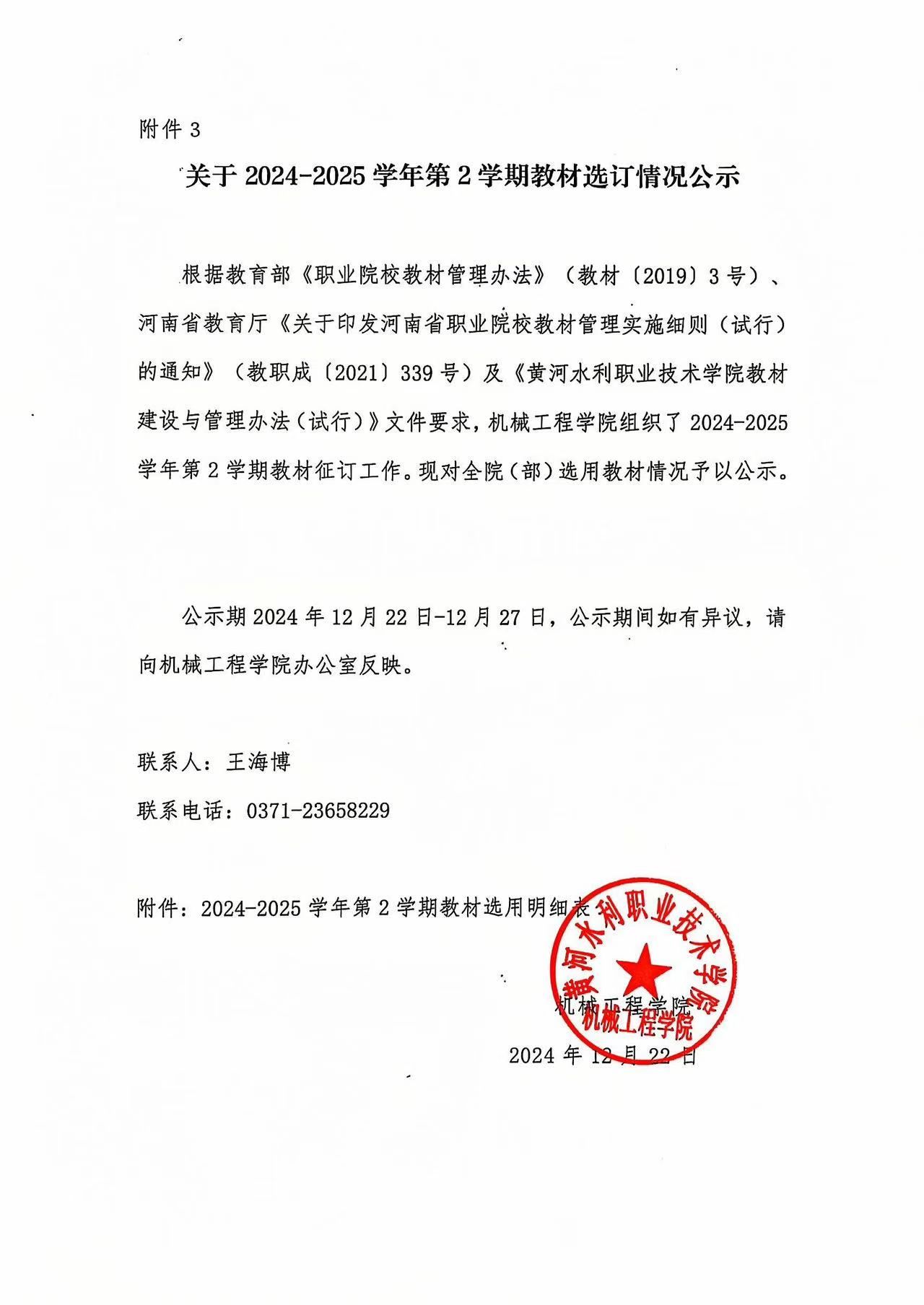 机械工程学院教材选用公示(2024-2025学年第2学期)