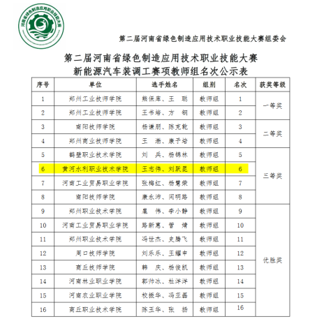 2023年11月23日至26日,第二届河南省绿色制造应用技术职业技能大赛“新能源汽车装调工”赛项在郑州工业技师学院成功举办。本次大赛为省级一类职业技能大赛,由省工业和信息化厅、省人力资源和社会保障厅、省生态环境厅、省市场监管局、共青团河南省委、省妇联联合主办。经过激烈角逐,我院汽车检测与维修教研室教师王志伟、刘跃昆获得教师组三等奖的优异成绩。