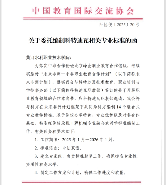 2025年1月,中国教育国际交流协会正式将我校制定的工程机械专业融合式教学标准纳入“未来非洲计划”框架之内,作为为科方编制的14个融合式专业教学标准之一。这一成果不仅标志着我校在中非职业教育国际合作领域迈出了坚实的步伐,同时也彰显了我校在工程机械专业领域的领先地位。