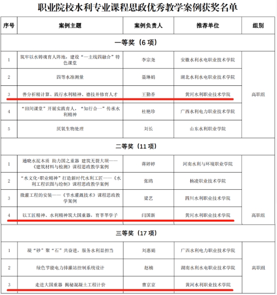 近日,中国水利教育协会发布《关于公布职业院校水利专业课程思政优秀教学案例遴选结果的通知》,水利高职院校和水利中职院校推荐的34个案例获评水利专业课程思政优秀教学案例,我校推荐的《善分析精计算、践行水利精神、德技并修育人才》等3个案例成功入选,并分别获得了一、二、三等奖。