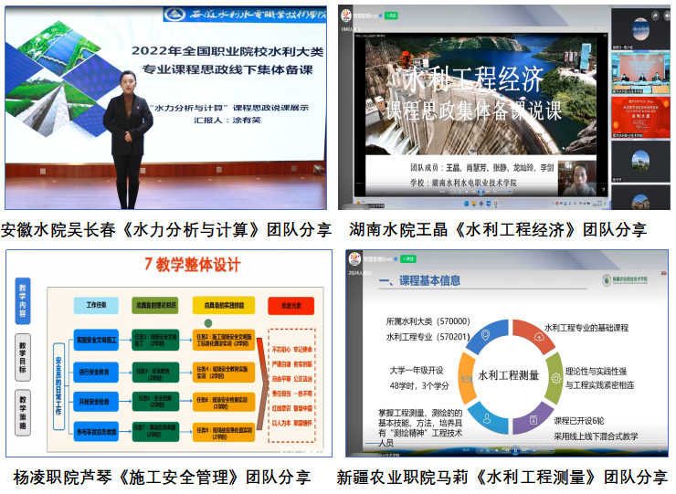我校水利工程学院张圣敏《水利工程制图》团队、重庆水利电力职业技术学院常允艳《工程测量》团队、安徽水利水电职业技术学院吴长春《水力分析与计算》团队、湖南水利水电职业技术学院王晶《水利工程经济》团队、杨凌职业技术学院芦琴《施工安全管理》团队、新疆农业职业技术学院马莉《水利工程测量》团队分别进行了课程思政说课和建设经验分享,并节选章节进行了课程思政教学展示。