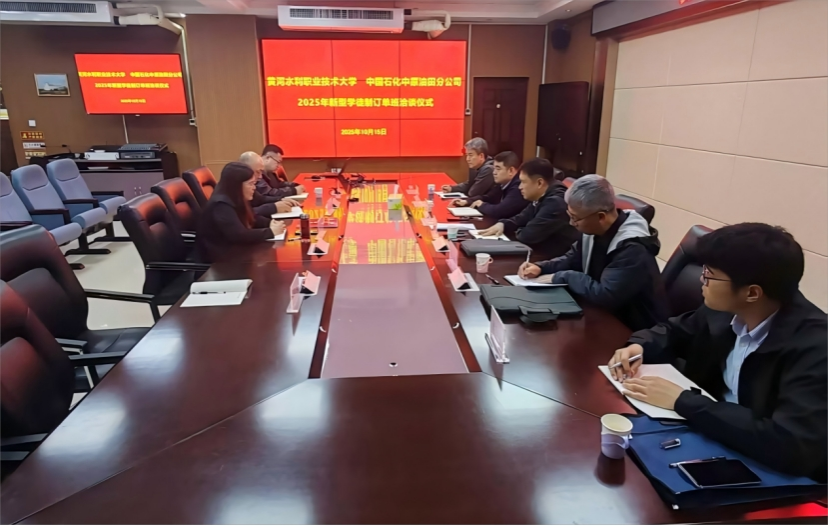 2025年10月15日,我校与中国石化中原油田分公司在教务处会议室举行第三期企业新型学徒制订单班洽谈仪式。中原油田分公司专家马传根一行出席洽谈仪式,教务处处长陶永霞、质量办公室主任张丹、副处长李孝坤参加会议。