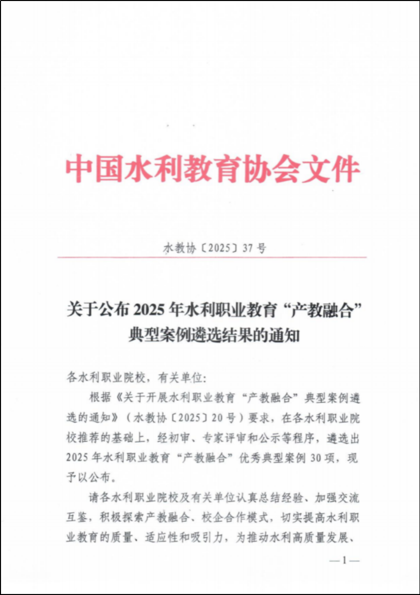 本次评选由中国水利教育协会主办,历经院校申报、材料初审、专家评审及结果公示等严格环节,从全国水利职业院校提交的百项案例中优中选优,旨在挖掘产教融合典型,推动水利职业教育与行业需求深度对接。我校两案例凭借创新性、实践性与示范价值脱颖而出。