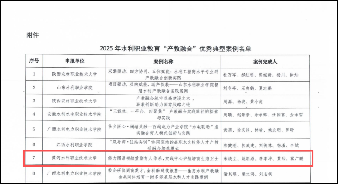 近日,2025年全国水利职业教育“产教融合”优秀典型案例遴选结果正式揭晓,我校推荐的《能力图谱领航重塑育人体系,实践中心护航培育生态卫士》《科教融汇赋能水土保持,校企共建引领生态治理——嵩县水土保持与碳过程科教融汇试验基地建设案例》两项成果成功入选。