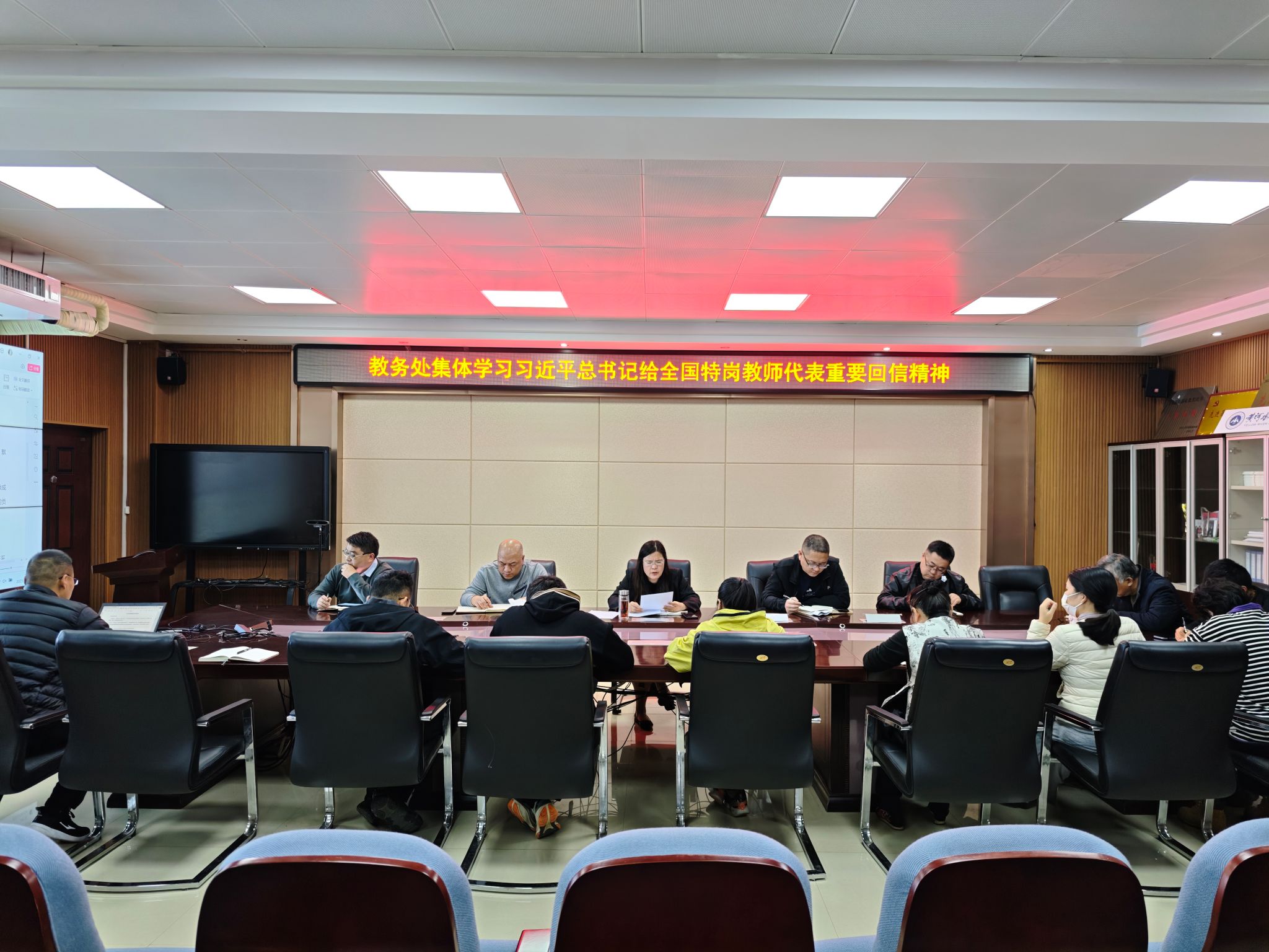 随后,陶永霞处长领学了习近平总书记给全国特岗教师代表的重要回信精神。她强调,总书记的回信充分体现了党中央对教师队伍特别是基层教育工作的高度重视和深切关怀,深刻阐述了教师在教育强国建设中的基础性作用。陶处长结合学校教学工作实际,指出教务处要以回信精神为指导,进一步优化教学管理,关心教师成长,推动教师队伍建设高质量发展,激励广大教师坚定理想信念,扎根教育一线,争做四有好老师。