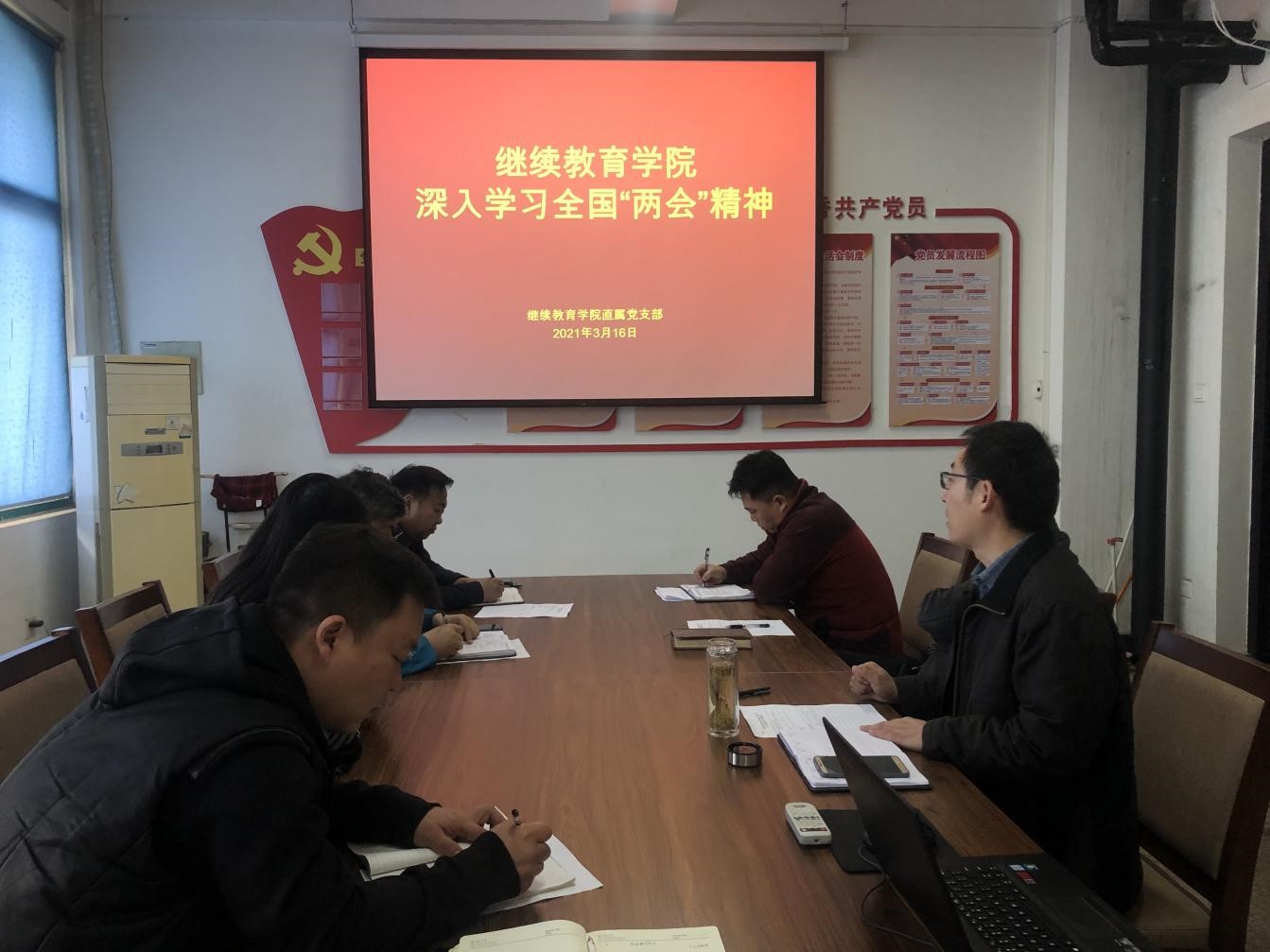 3月16日上午,继续教育学院在四号教学楼四楼会议室召开会议,传达学习全国“两会”精神,会议由院长杜广平主持,全体教职工参加学习。