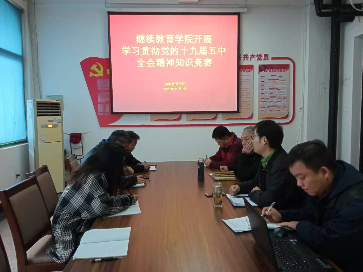为深入学习贯彻党的十九届五中全会精神,切实把思想和行动统一到中央的重大决策部署上来。12月2日,继续教育学院开展学习贯彻党的十九届五中全会精神知识竞赛,全体教职工参加。