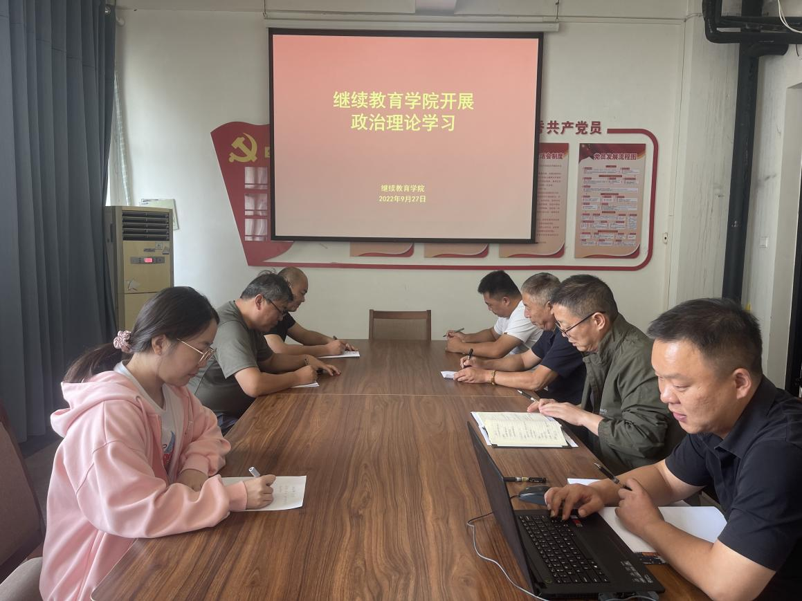9月27日,继续教育学院在4号教学楼四楼会议室开展政治理论学习,会议由党支部书记薛建荣主持,全体教职工参加。