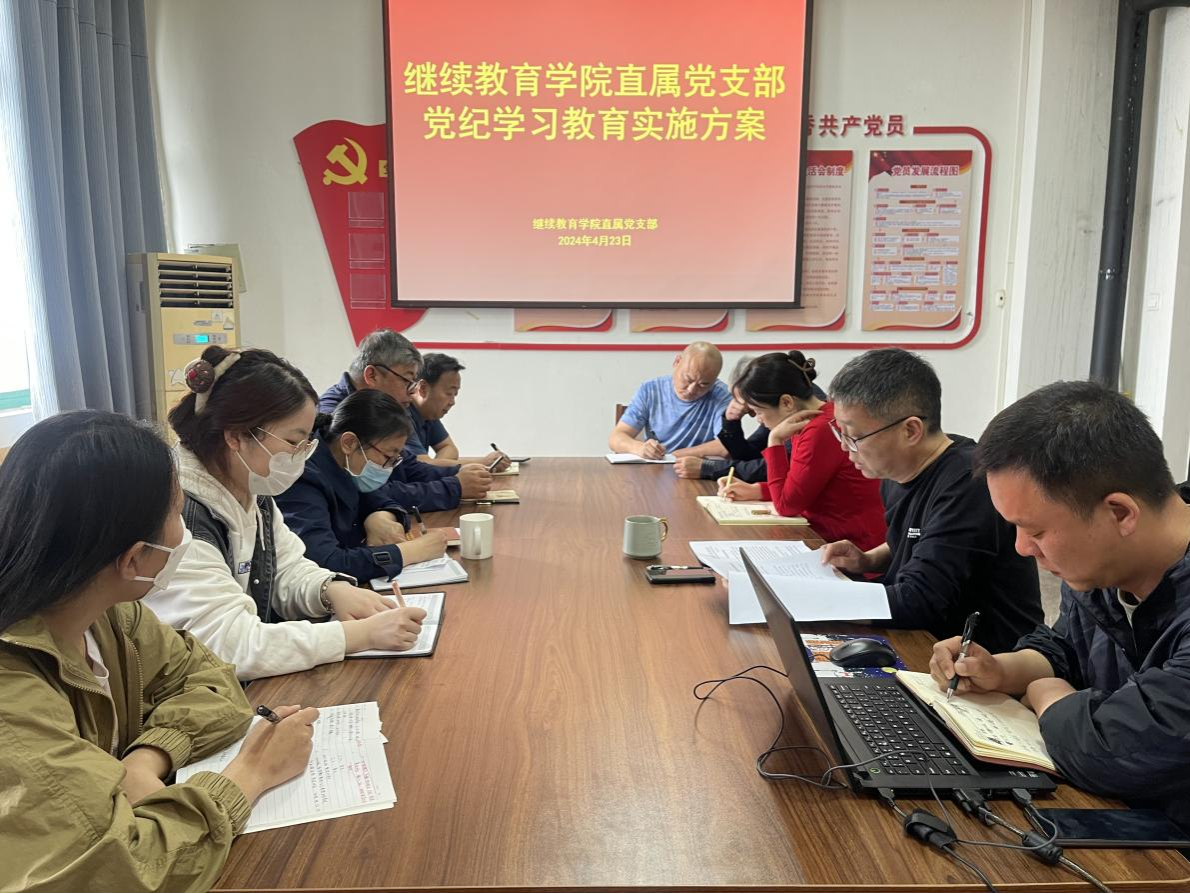 2024年4月23日,继续教育学院在4号教学楼四楼会议室集中学习党纪学习教育实施方案,会议由院长薛建荣主持,全体教职工参加。