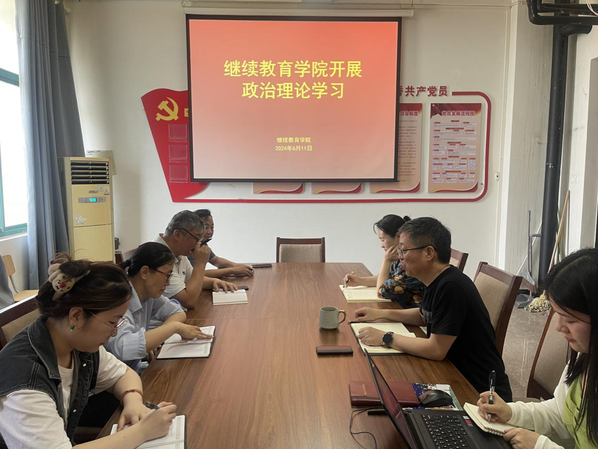 2024年6月11日,继续教育学院在4号教学楼四楼会议室开展政治理论学习,会议由院长薛建荣主持,全体教职工参加。