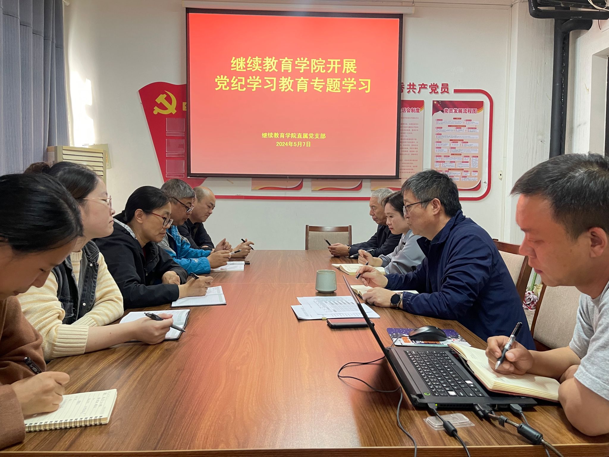 2024年5月7日,继续教育学院在4号教学楼四楼会议室开展党纪学习教育专题学习,会议由院长薛建荣主持,全体教职工参加。
