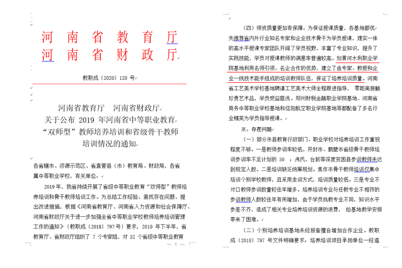 近日,我校“双师型”教师培训工作受到了省教育厅、省财政厅的通报表扬,我校是2016年省教育厅命名的首批“河南省中等职业学校双师型教师培养培训基地”,近年来已经连续三年承接了省教育厅的培训任务,累计培训中等职业院校教师300人次,从我校基地经过培训的教师在当年参加省“双师型教师”认定,通过率为100%。