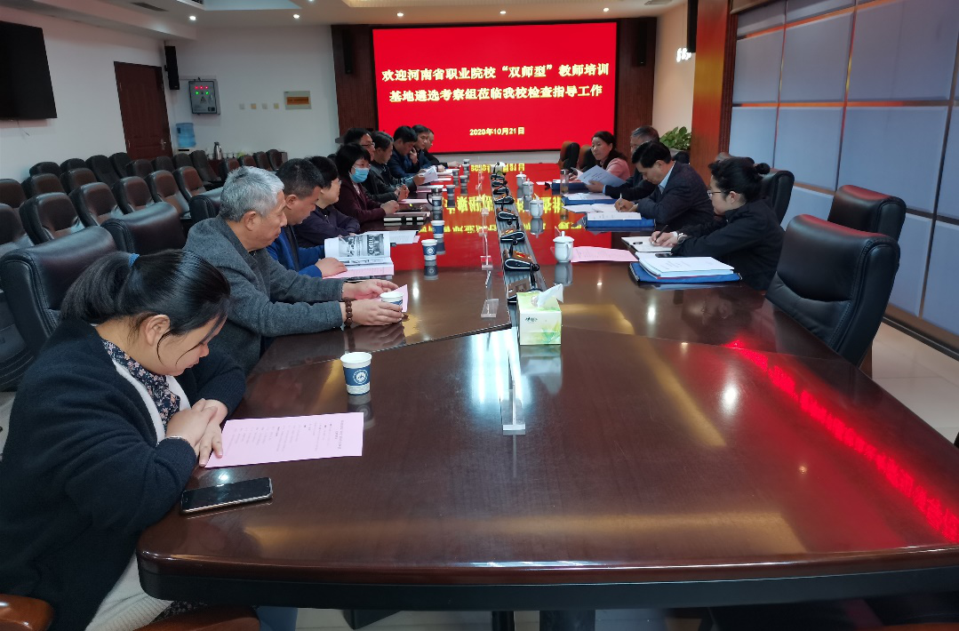 10月21日下午,以长垣烹饪职业技术学院院长王金台为组长的河南省职业院校“双师型”教师培养培训基地遴选考察组一行4人莅临我校检查指导工作。我校在行政楼第二会议室召开工作汇报会,校长祝玉华及相关教学单位负责人、合作企业代表出席会议。会议由继续教育学院院长杜广平主持。