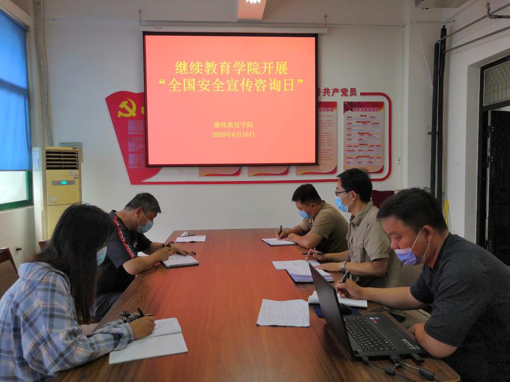 6月16日是全国安全宣传咨询日。继续教育学院在四号教学楼4楼会议室召开2020年“安全生产月”工作会议,继续教育学院全体教职工参加会议,会议由院长杜广平主持。会议传达了学校2020年“安全生产月”活动实施方案。