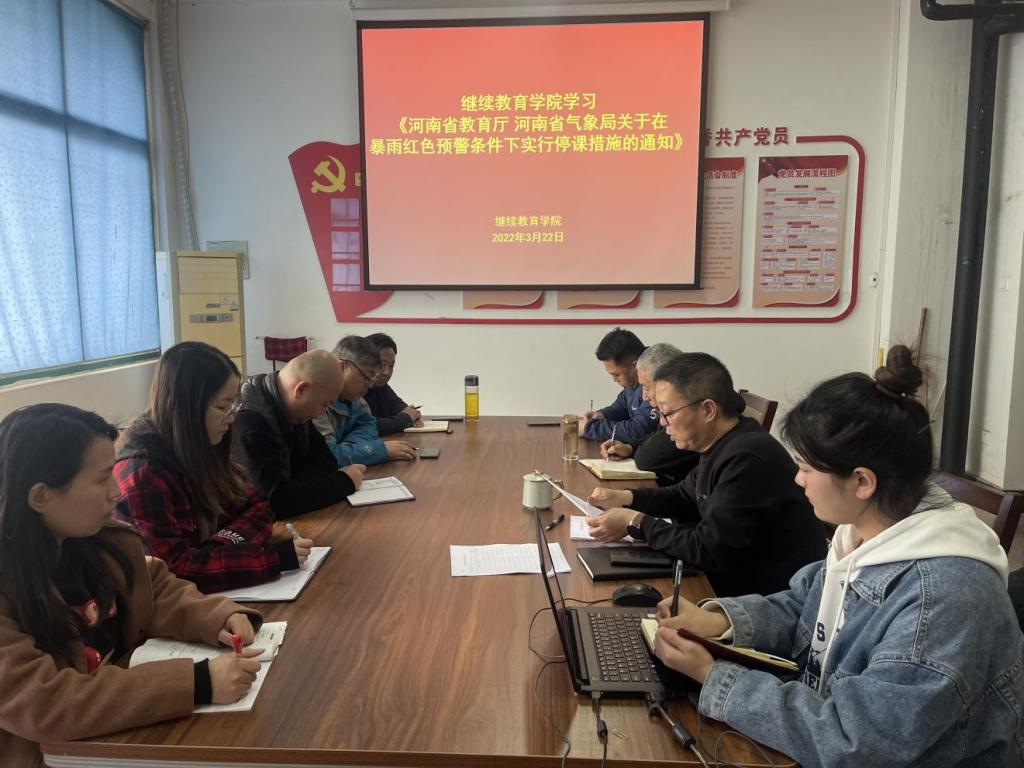 近日,河南省教育厅、河南省气象局印发《关于在暴雨红色预警条件下实行停课措施的通知》,并从2022年4月1日起施行。3月22日上午,继续教育学院全体教职工深入学习通知精神。会议由院长薛建荣主持。