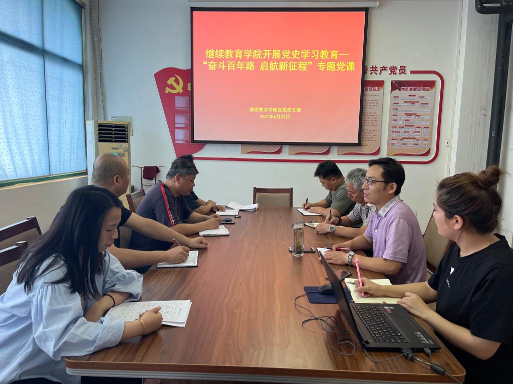 6月22日,继续教育学院在4号教学楼4楼会议室开展党史学习教育—“奋斗百年路 启航新征程”专题党课,会议由院长杜广平主持,全体教职工参加。