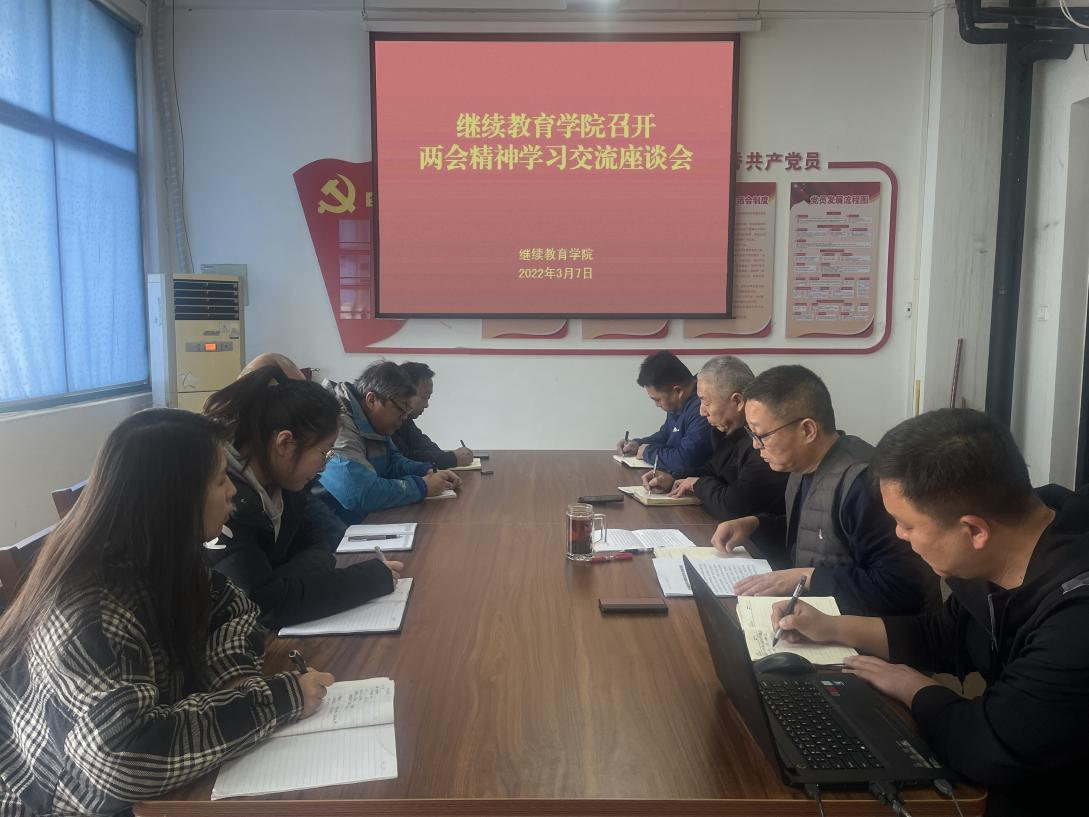 3月7日,继续教育学院召开“两会”精神学习交流座谈会,全体教职工参加。会议由院长薛建荣主持。