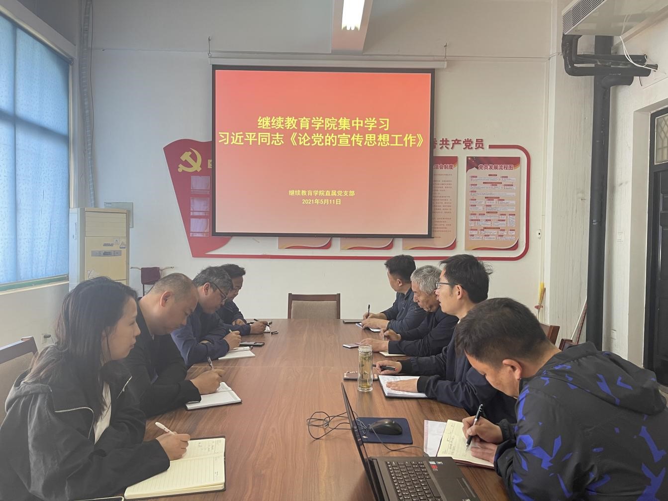 2021年5月10日,继续教育学院在四号教学楼四楼会议室召开政治理论学习,集中学习习近平同志《论党的宣传思想工作》,会议由院长杜广平主持,全体教职工参加学习。