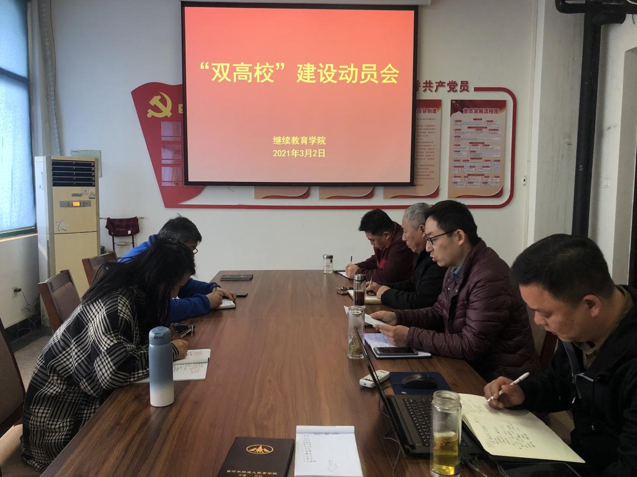 2021年3月2日上午,继续教育学院在四号楼会议室召开“双高校”建设动员会,会议由院长杜广平主持,对继续教育学院“双高校”建设工作进行全面部署和动员。