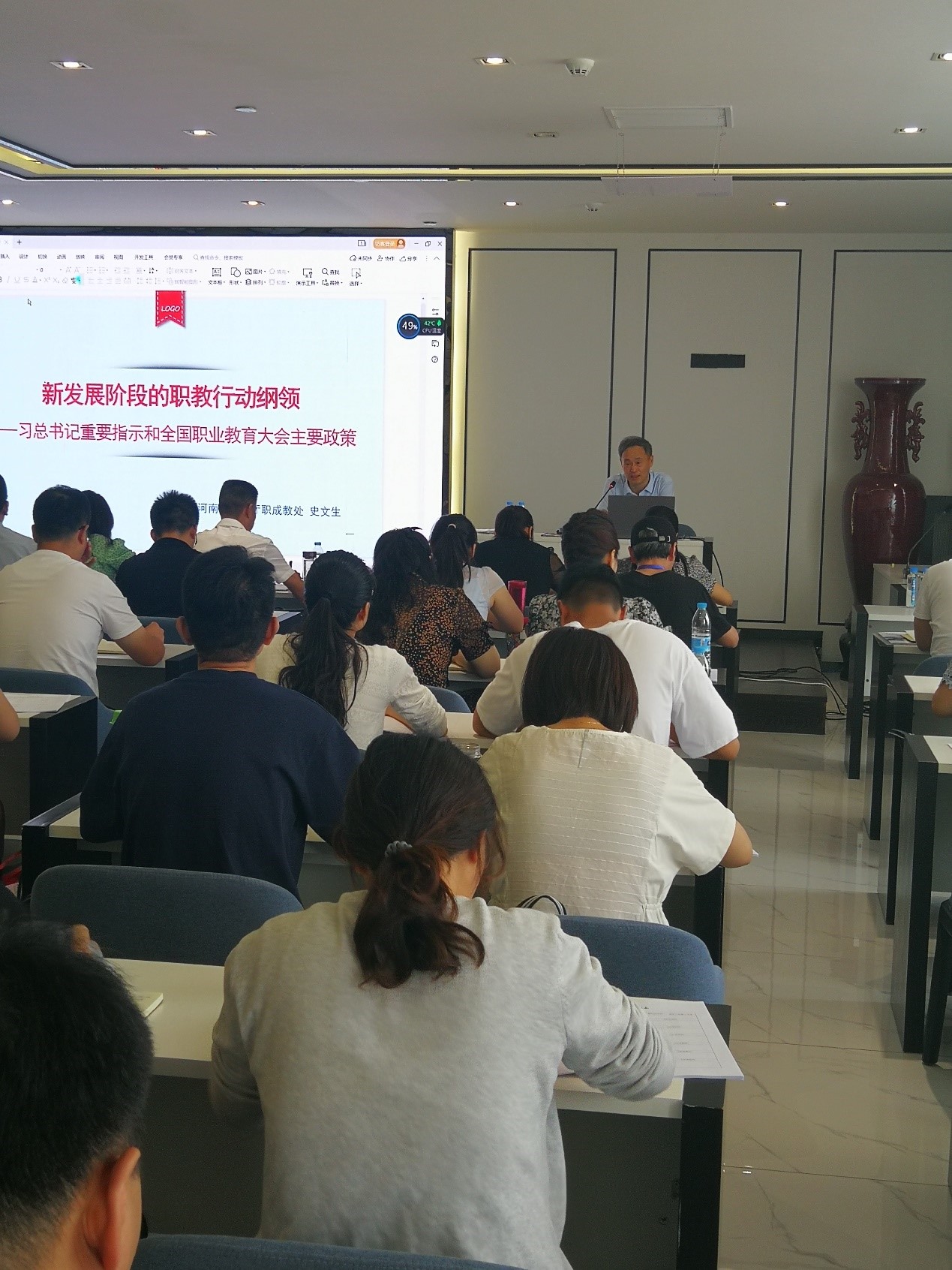6月26日,河南省教育厅职成教处副处长史文生到我校为2021年河南省职业院校“双师型”教师培训班学员做报告,宣讲全国职业教育大会精神。培训班工作人员,全体学员共140余人参会,报告会由继续教育学院院长杜广平主持。
