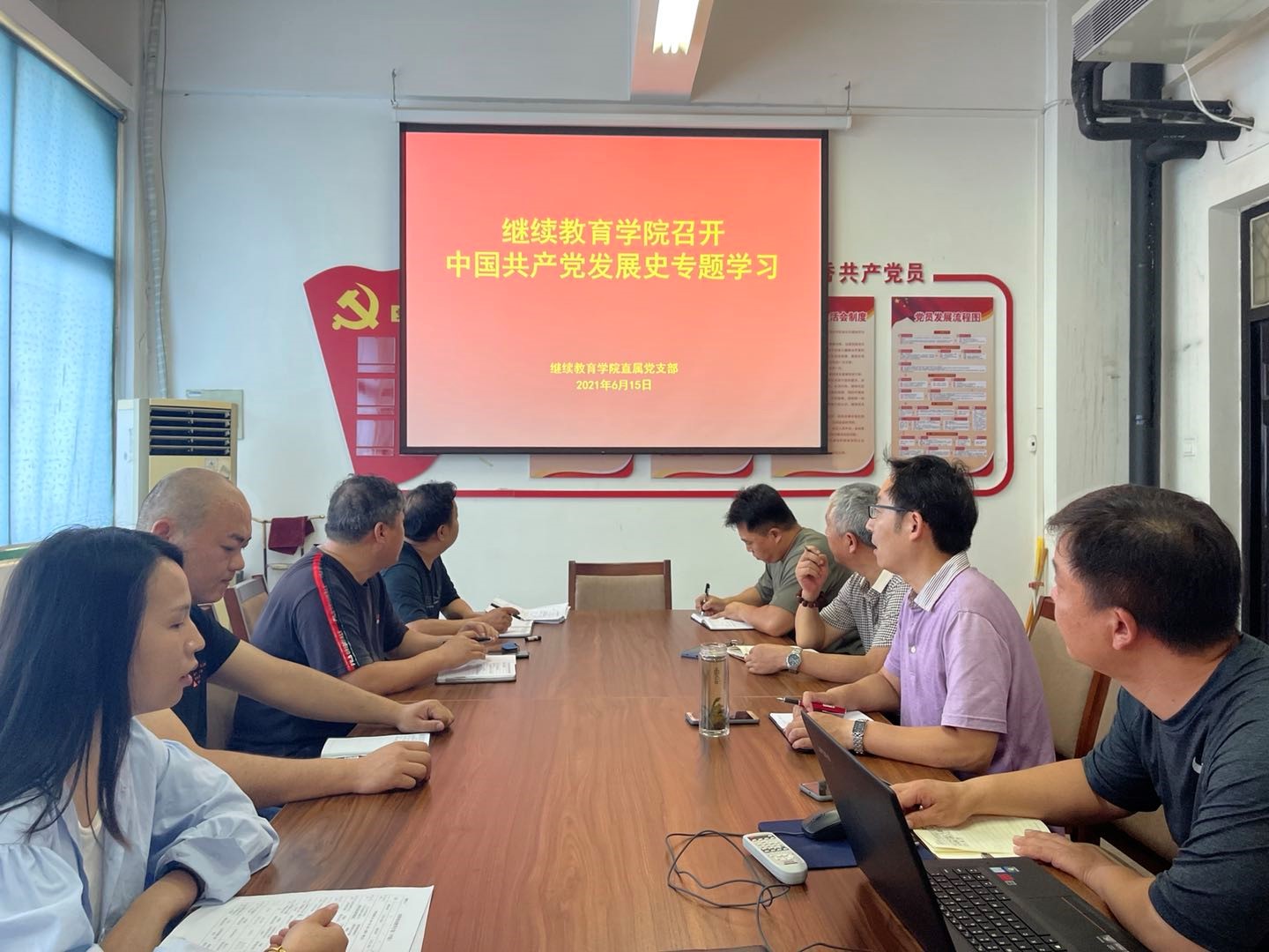 6月15日,继续教育学院在4号教学楼四会议室召开专题会议,集中学习中国共产党发展史,会议由党支部书记杜广平主持,全体教职工参加。