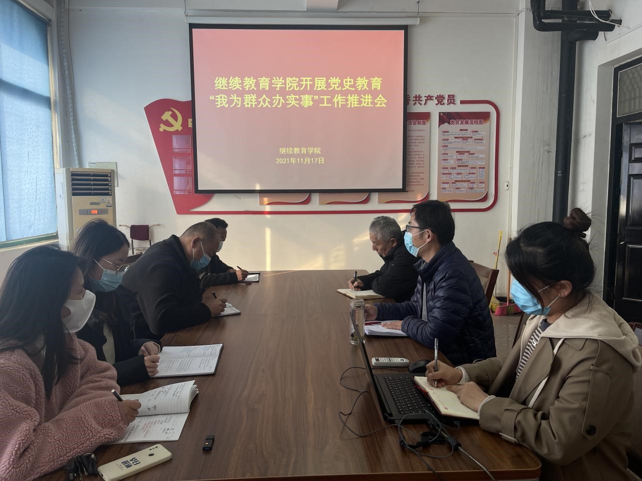 为持续推动“我为群众办实事”工作走深走实,11月17日下午,继续教育学院在4号教学楼四楼会议室开展党史教育“我为群众办实事”工作推进会,会议由院长杜广平主持,全体教职工参加。