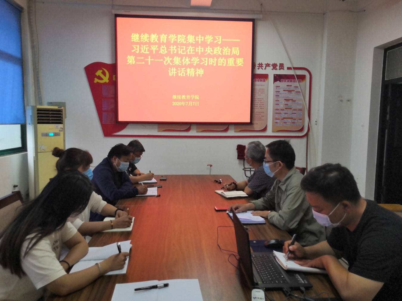 7月7日下午,继续教育学院院长杜广平主持召开政治理论学习,集中学习习近平总书记在中央政治局第二十一次集体学习时的重要讲话精神,全体教职工参加学习。