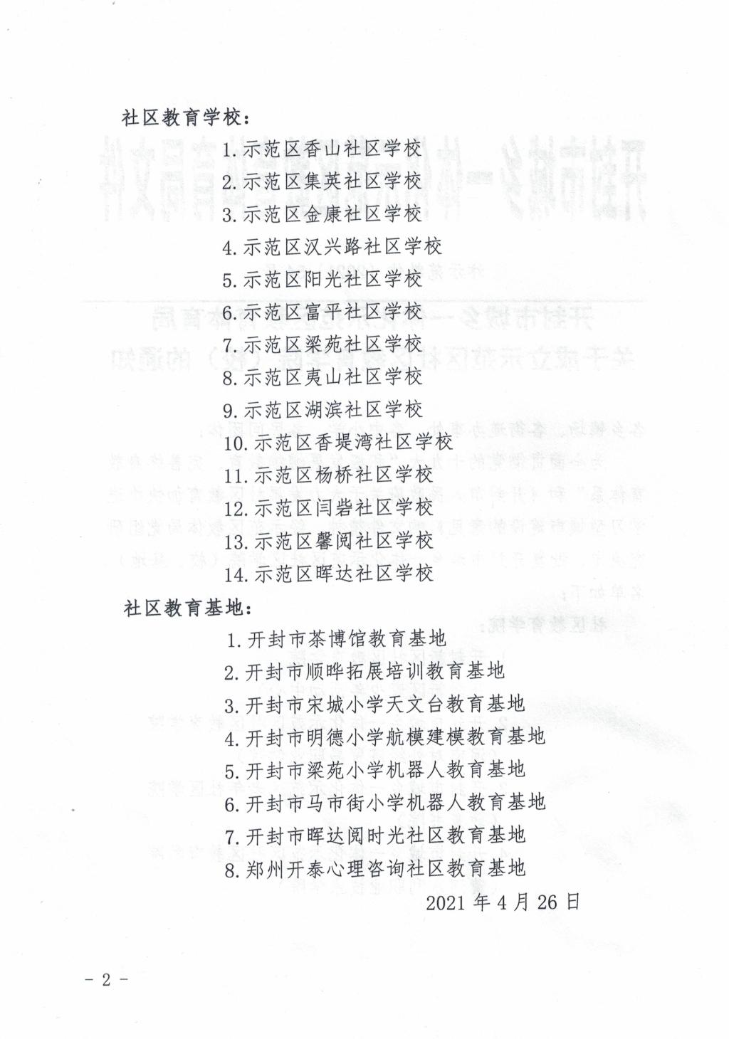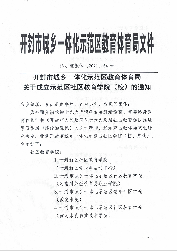 近日,开封市城乡一体化示范区教育体育局印发《开封市城乡一体化示范区教育体育局关于成立示范社区教育学院(校)的通知》汴示范教体{2021}54号,学校申报成功“开封市城乡一体化示范区社区教育学院”。