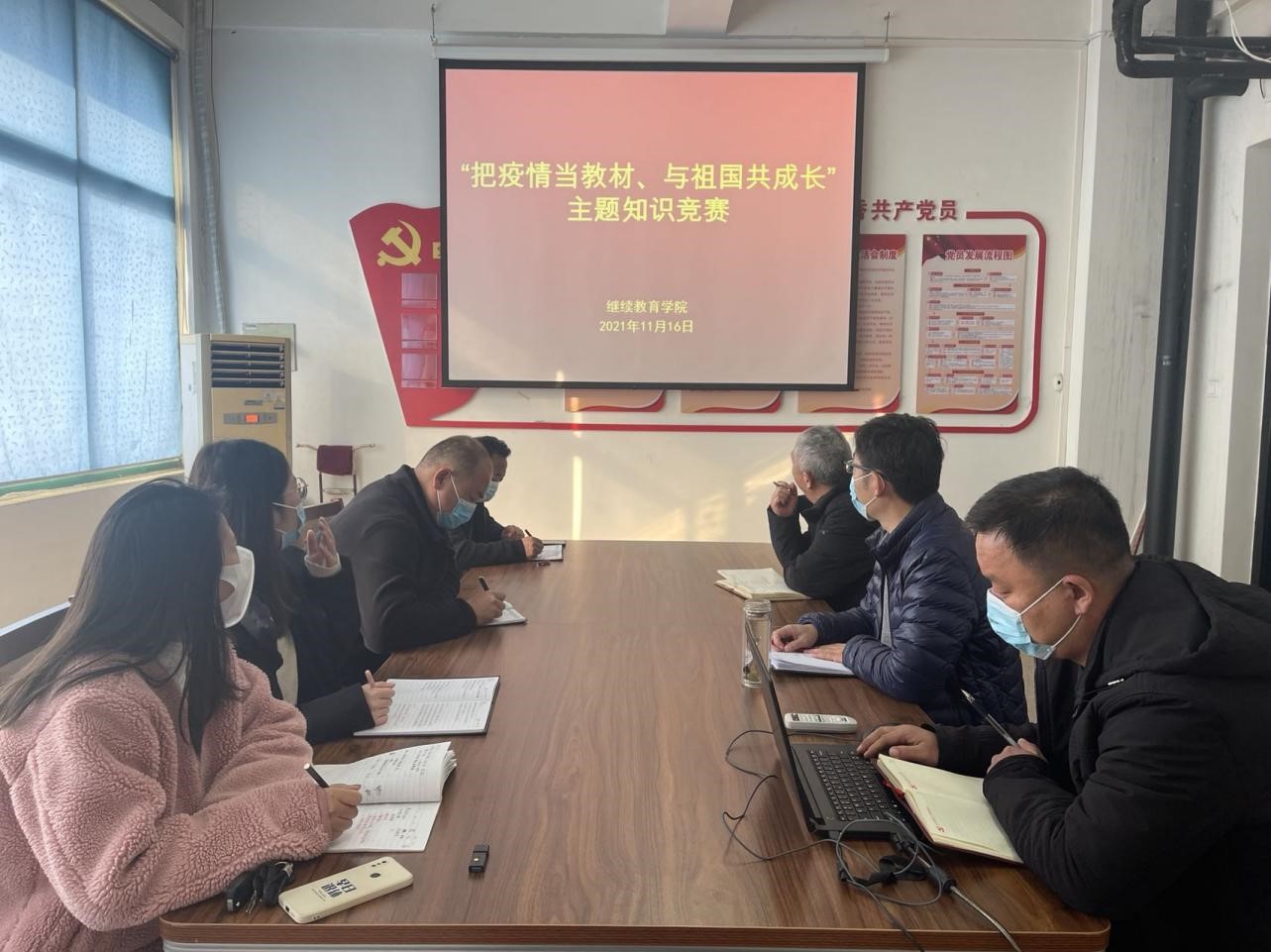 为进一步提高全体教职工的疫情防控意识和防灾减灾意识,把灾难危机转化为教育契机,11月16日,继续教育学院在会议室开展“把疫情当教材、与祖国共成长”主题知识竞赛,全体教职工参加。
