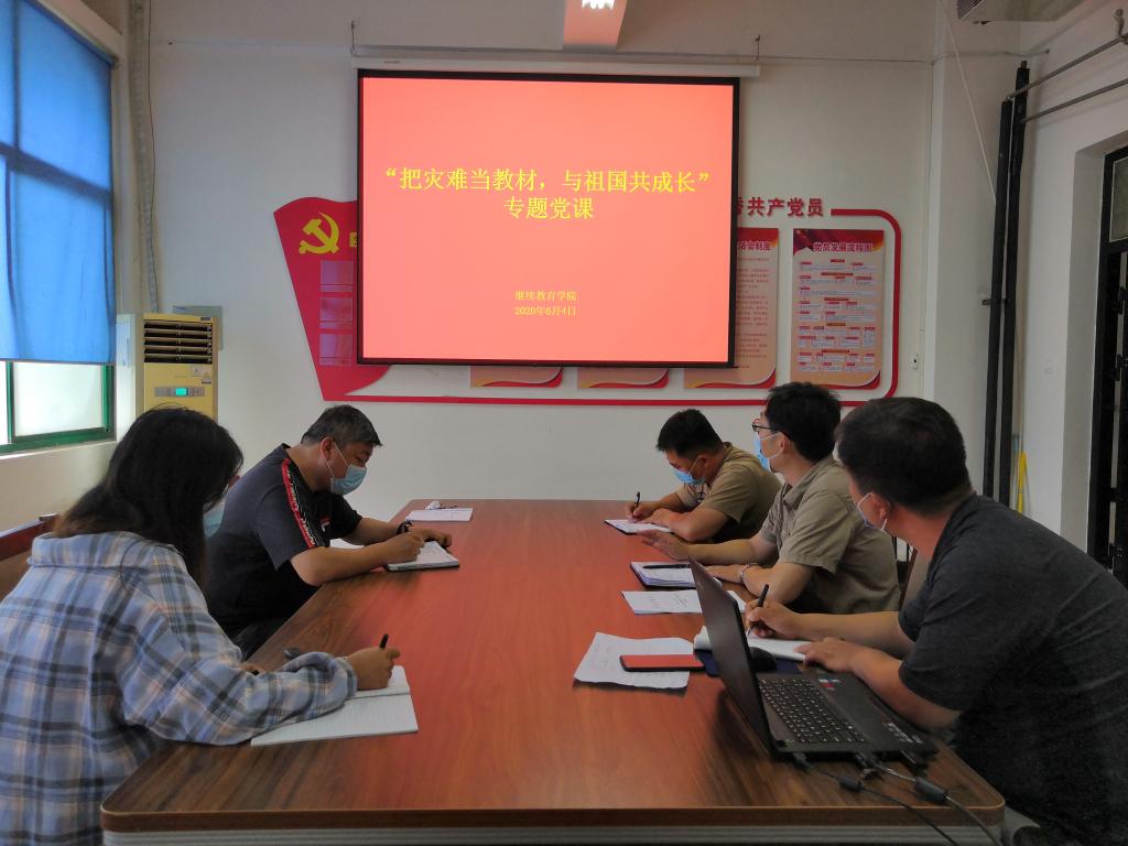 6月9日继续教育学院开展“把灾难当教材 与祖国共成长”专题安全教育党课,激发全院教职工的责任担当,引导教职工把灾难当教材、把困难当磨砺,做到在灾难面前与国家共患难。继续教育学院院长杜广平为全体党员干部上专题安全教育党课。