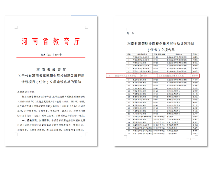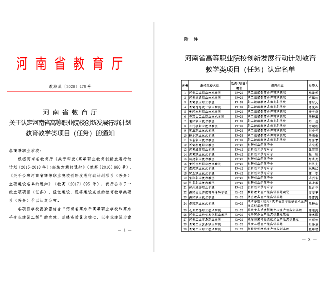 近日,河南省教育厅下发《关于认定河南省高等职业院校创新发展行动计划教育教学类项目(任务)的通知》(教职成〔2020〕478 号),对建设完成的创新发展行动计划教育教学类项目(任务)认定名单予以公布。