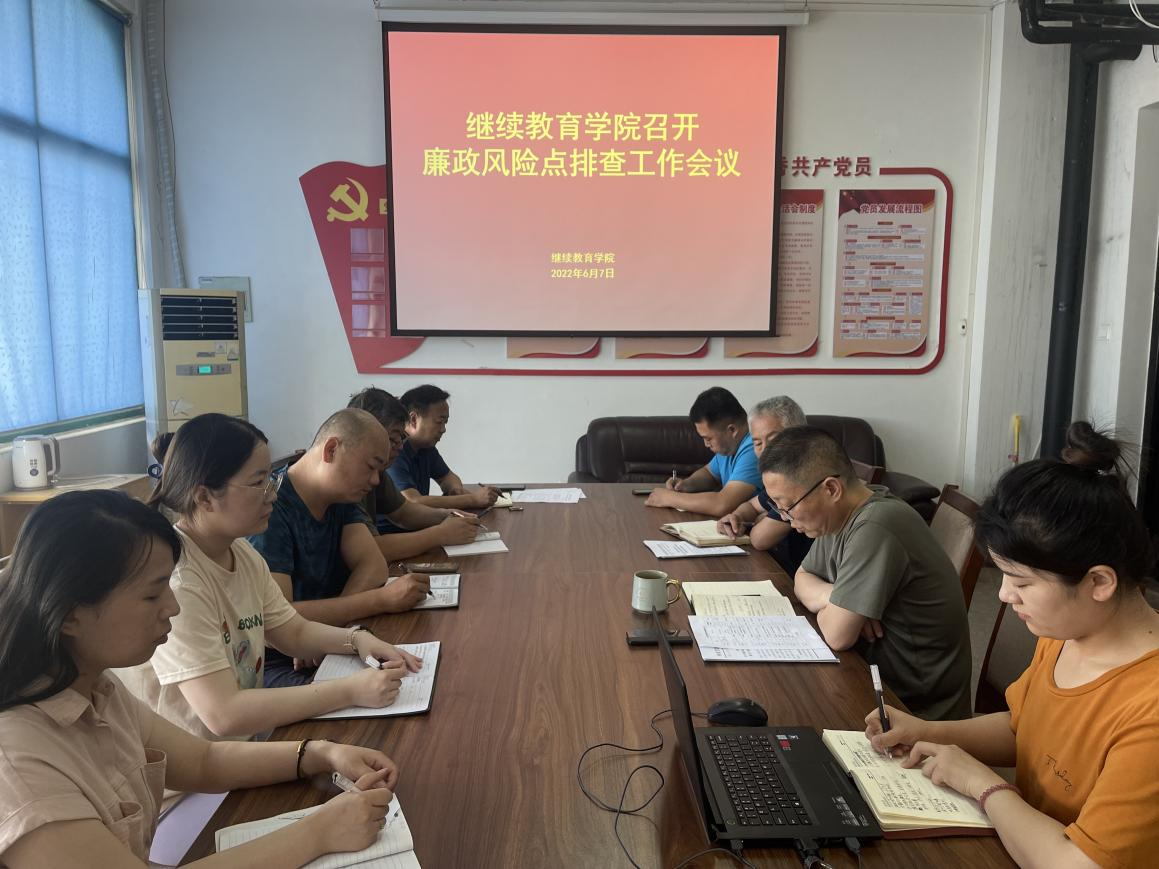 为深入贯彻学校“能力作风建设年”活动安排部署,根据学校纪委《关于开展廉政风险点排查的通知》文件要求,6月7日,继续教育学院在4号教学楼四楼会议室召开廉政风险点排查工作会议,会议由院长薛建荣主持,全体教职工参加。