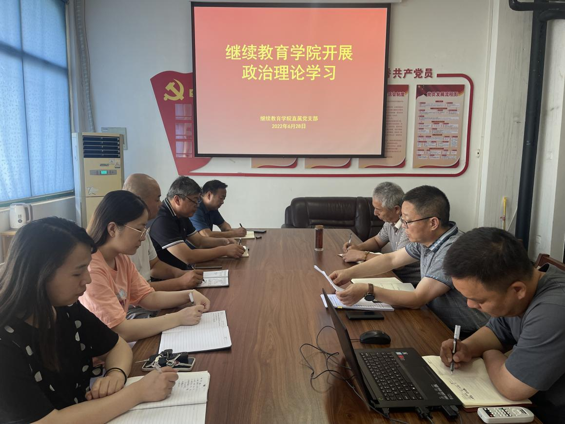 6月28日,继续教育学院在4号教学楼四楼会议室开展政治理论学习,会议由党支部书记薛建荣主持,全体教职工参加。