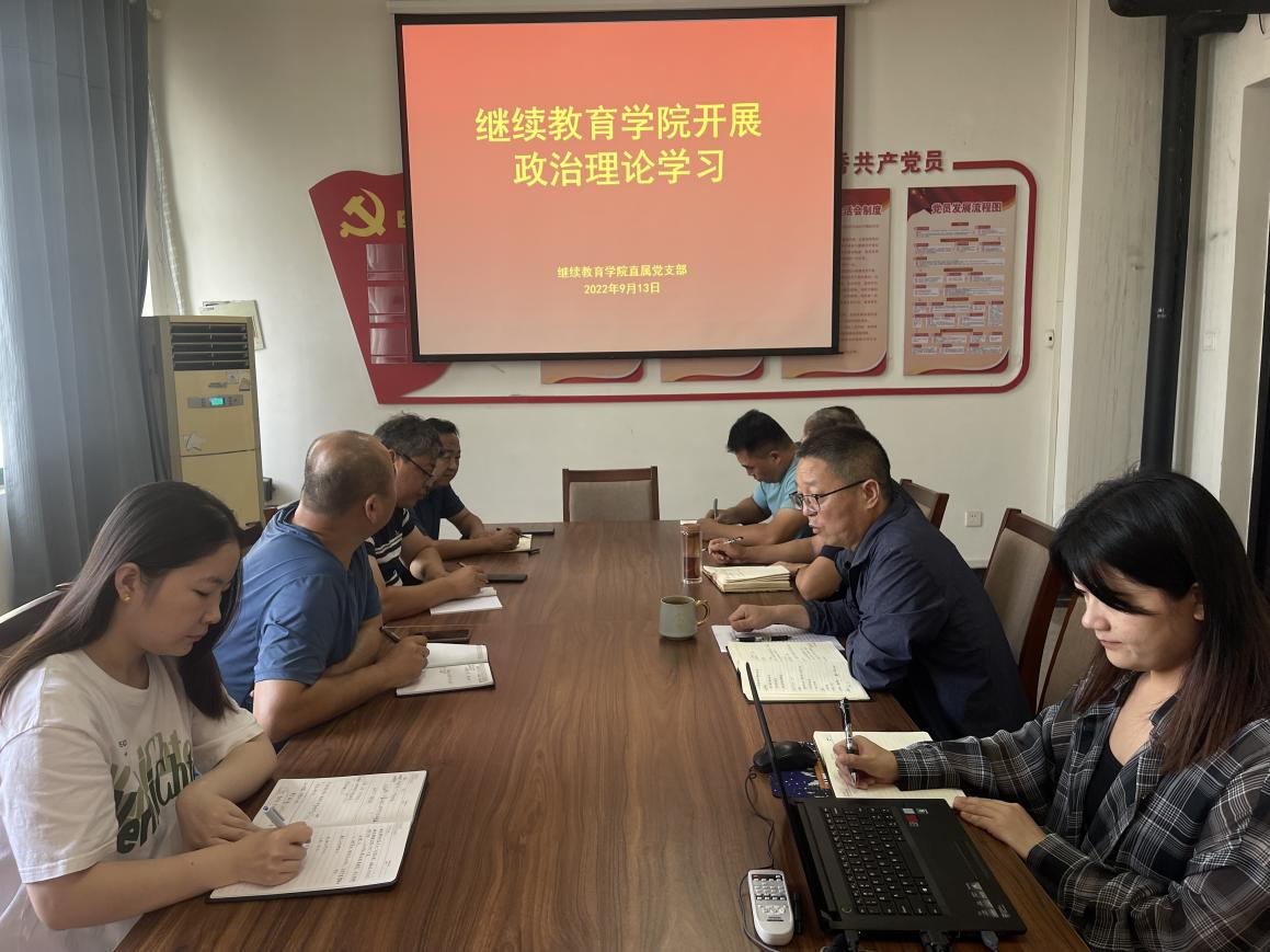 2022年9月13日,继续教育学院在4号教学楼四楼会议室开展政治理论学习,会议由党支部书记薛建荣主持,全体教职工参加。