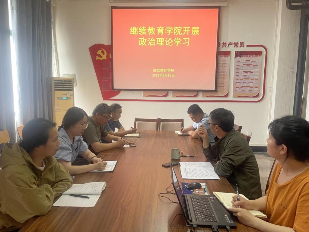 2023年5月16日,继续教育学院在4号教学楼四楼会议室开展政治理论学习,会议由院长薛建荣主持,全体教职工参加。